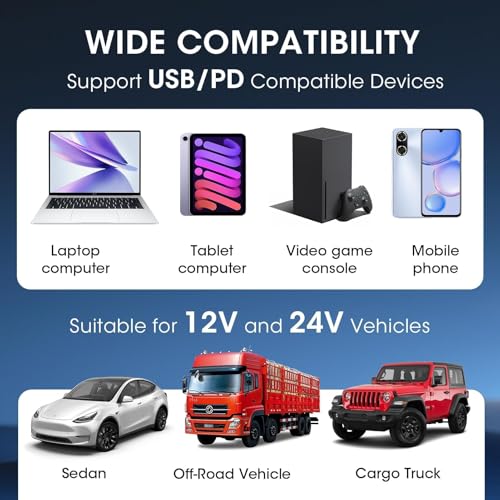 【Ultraschnelles 66W Laden】:Mit 6 USB-Anschlüssen (2 PD, 2 USB-A 3.1A, 1 Super Charge, 1 SCP/QC3.0) ermöglicht dieses KFZ-Ladegerät das gleichzeitige Aufladen mehrerer Geräte und unterstützt 12V–24V Eingangsspannung für PKW, SUV, Transporter und LKW.