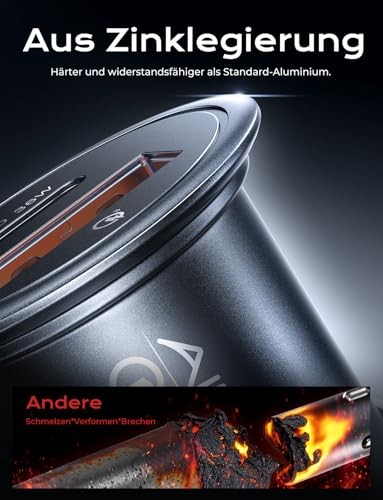 Ⅲ. PREMIUM VOLLMETALL (ZINKLEGIERUNG): Hochwertiges, kratzfestes und langlebiges Metallgehäuse. Bleibt auch bei Dauerbetrieb spürbar kühler als Plastiklader. Schont den Zigarettenanzünder-Sockel vor Verschleiß.