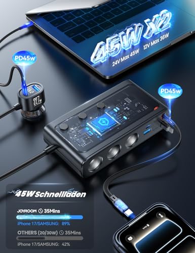 JOYROOM 227W Zigarettenanzünder Verteiler 9 in 1, Auto KFZ Ladegerät Adapter mit 80cm einziehbare 45W Typ-C & Lighting Schnellladekabel, 3 Fach 12V/24V Stecker mit Separatem Schalter für iPhone 17