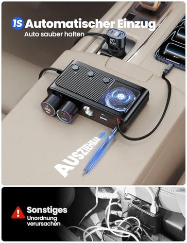 ⚡【80cm einziehbaren 45W Schnelles Laden Kable】Das USB zigarettenanzünder adapter Multi Port besteht aus 2*USB C(MAX 45W)+ 2*USB A (MAX 22.5W)+80cm einziehbaren 45W type C Kabel & 12W Lighting Kabel + 3*Zigaretten -Leichtersplitter -Sockeln(Max 120W). Die eingebauten intelligenten Chips des zigarettenanzünder verteiler erkennen automatisch den Verteilungsstrom für gleichzeitiges schnelles Laden, kompatibel mit iPhone, Samsung, LG, Xiaomi, Huawei, Google, etc.