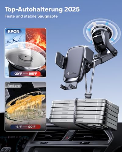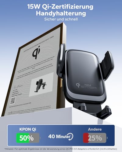 KPON 15W Qi Handyhalterung Auto mit Ladefunktion, Induktive Ladestation Auto mit Sauger & Clip, Automatische Klemmung Kfz Wireless Charger für iPhone 17/16/15/14/13, Samsung (Ohne Zigarettenanzünder)