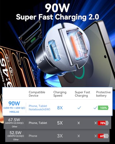 90W-Schnellladung: Das MRGLAS-Autoladegerät unterstützt PD 45 W (USB-C-Anschluss) und QC 45 W (USB-A-Anschluss) mit hoher Ausgangsleistung, wodurch alle gängigen Mobiltelefone/elektronischen Geräte gleichzeitig schnell aufgeladen werden können, zehnmal schneller als 30 W Zigarettenanzünder USB Times, dieser leistungsstarke Ausgang kann ein iPhone 17 Pro Max oder Samsung S25 in 30 Minuten zu 85 % aufladen.
