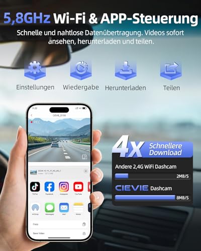 【5,8 GHz WLAN & 4x Schneller】Unsere Dashcam unterstützt 5,8 GHz WLAN, das 4K-Videos 4x schneller überträgt als das Standard-2,4-GHz. Über unsere App können Sie live streamen, Videos herunterladen, Ihre Fahrten in sozialen Medien teilen oder HD-Beweise für Unfälle liefern. Kein Kabel, kein PC, nur sofortiger Zugriff.