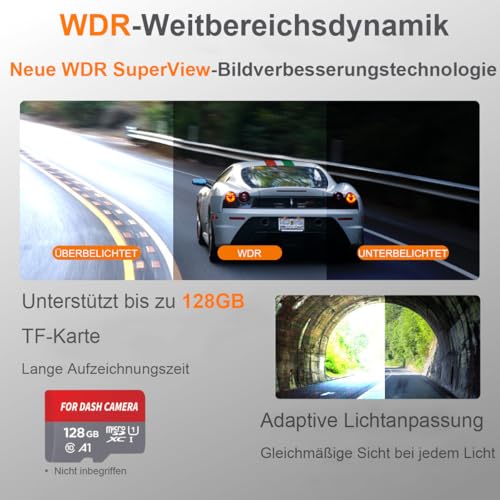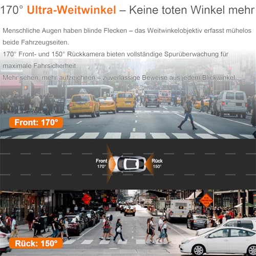 Mit einem 170°-Weitwinkelblickwinkel der Frontkamera und 140° der Rückkamera überwacht unsere Dashcam mehrere Fahrspuren und erkennt Fahrzeuge, die sich aus allen Richtungen nähern.