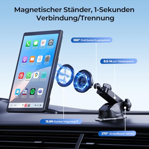 8“ Tragbares Carplay Display für Apple CarPlay & Android Auto, 1440×900 HD Display, Magnetische Halterung, OTA-Updates, Rückfahrkamera, Bluetooth, Sprachsteuerung, GPS-Navigation