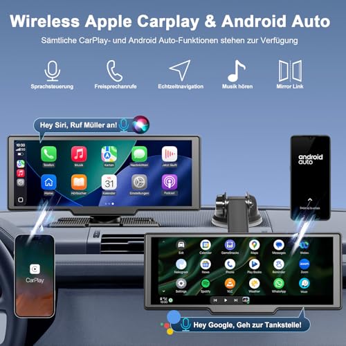 Carplay Display für Apple Car Play Android Auto, 10,26 Zoll Tragbares Wireless CarPlay mit 1080P Rückfahrkamera, GPS Navigation, Bluetooth 5.2 Sprachsteuerung Mirror Link AUX FM, unterstützt TF Karte