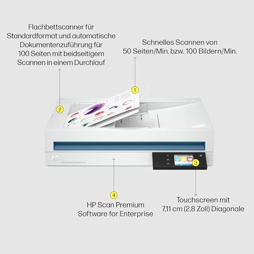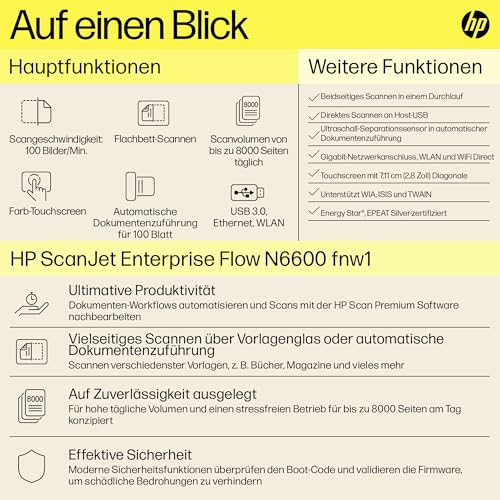 HP ScanJet Enterprise Flow N6600 fnw1, Scanner, ADF, Flachbettscanner, Ethernet, USB 3.0, WiFi, Touchscreen, bis zu 8.000 Seiten täglich