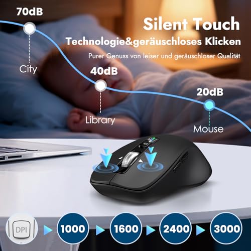 Kabellose Maus für Laptop, Multi-Device Bluetooth Maus, 4 DPI Silent Mouse, 4-Wege Scrolling Ergonomisch Mice für Windows, Volle Größe Mäuse für Laptop PC Computer Tabletten