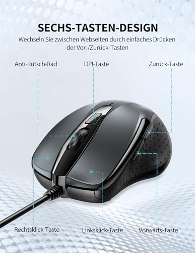 ERGONOMISCHES DESIGN: Das ergonomische Konturdesign und der weiche Gummigriff passen sich besser der Hand an und ein besserer Komfort kann Ermüdung und Stress durch Langzeitgebrauch reduzieren. Das Sechs-Tasten-Design umfasst Vor-/Zurück-Tasten für höhere Produktivität und Effizienz.