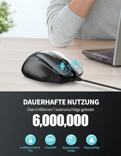 TECKNET Maus mit Kabel, Computermaus mit 6 Tasten, 6400 DPI, Ergonomisches Optical Business Kabelgebundene Maus für PC, Laptop, USB-Kabel 150 cm, Grau