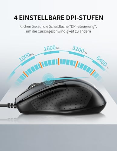 PRÄZISE STEUERUNG: Computermaus mit Kabel von TECKNET bietet eine präzise, intelligente Cursorsteuerung und -verfolgung auf einer Vielzahl von Oberflächen. Vier einstellbare DPI-Stufen (6400/3200/1600/1000) können nach Belieben umgeschaltet werden, um Ihren täglichen und beruflichen Anforderungen gerecht zu werden.