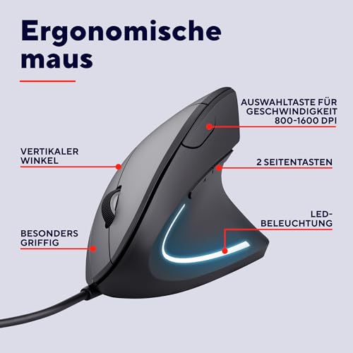 Trust Verto Vertikale Ergonomische Maus, Vorbeugung Gegen Mausarm/Tennisarm (RSI Syndrom), 1000/1600 DPI, LED-Beleuchtung, PC Maus mit Kabel für Rechtshänder, Computer, Laptop, Mac – Schwarz