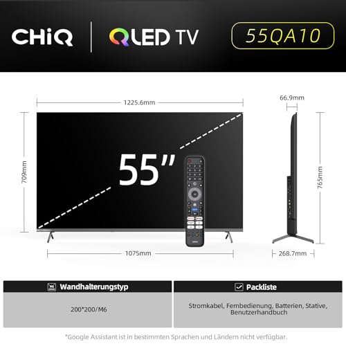 CHIQ 55QA10 55 Zoll (140 cm) 4K Ultra HD QLED Smart TV, HDR10, VRR & ALLM | Ultra-dünnes Metallisches Randlos-Design | Dolby Audio | Triple Tuner (DVB-C/T/T2/S/S2) | Dual-Band