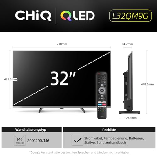 CHIQ Fernseher 32 Zoll FHD, QLED, HDR10, Google TV, Dolby Audio, DBX-tv, Triple Tuner, WLAN, 2.4G/5G, Google Assistant, Schwarz