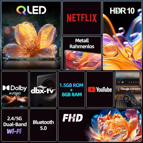 Erleben Sie den Smart Google TV und greifen Sie problemlos auf Streaming-Dienste wie Netflix, YouTube und Disney+ zu. Genießen Sie nahtlose Konnektivität mit Bluetooth und integriertem WiFi. Nutzen Sie Google Assistant für die Sprachsteuerung