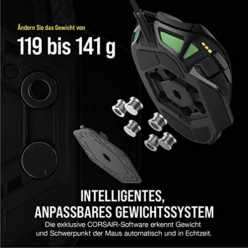 Intelligentes anpassbares Gewichtssystem: Die CORSAIR-exklusive Software erkennt den Schwerpunkt, so können Sie das Gewicht und das Gleichgewicht präzise auf Ihren Griffstil abstimmen
