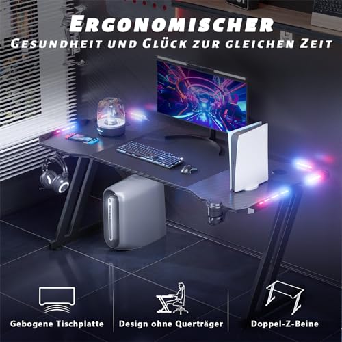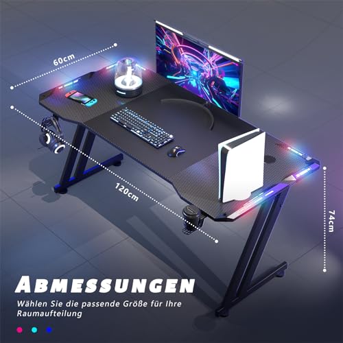 120 x 60 cm Gaming Tisch, Gaming Schreibtisch mit LED, PC Tisch Gaming mit Kohlefaseroberfläche, Stabiler Computertisch für Gaming mit Kopfhörerhaken und Getränkehalter, Schwarz