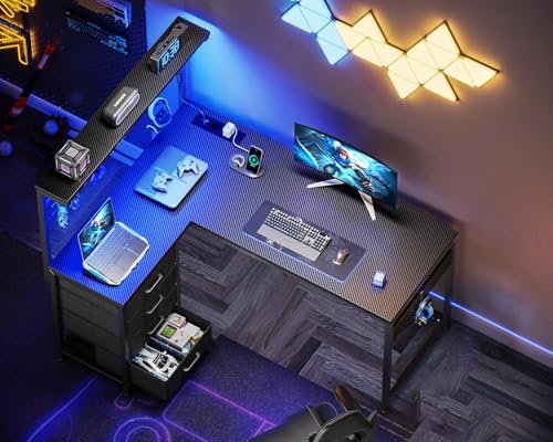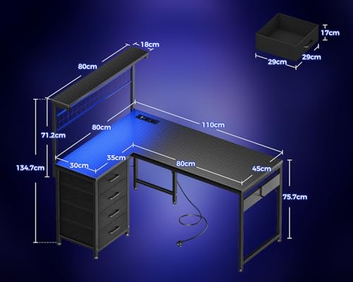 Coleshome Gaming Tisch mit LED, 110×80 cm Reversibler Gaming Schreibtisch mit Schubladen & Steckdosen, Eckschreibtisch mit Ablagefach & Stauraum, Kohlefaser Schwarz