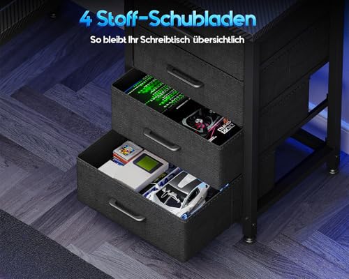 【Flexibles L-förmiges Design – Vielseitiger Arbeitsplatz】 Dieser Gaming Tisch verfügt über ein flexibles, umkehrbares L-förmiges Design, das eine Installation auf der linken oder rechten Seite ermöglicht und sich somit perfekt an verschiedene Raumlayouts anpasst. Ausgestattet mit einem austauschbaren oberen Regal, Schubladen, Steckdosen, LED-Lichtleiste und Kopfhörerhaken bietet er eine modulare und effiziente Arbeitsfläche, die die Raumausnutzung erheblich verbessert.
