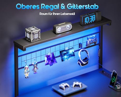 【Intelligente LED-Beleuchtung – Für ein immersives Erlebnis】 Die in die obere Ablage des Gaming Tisch integrierte LED-Leiste bietet 10 Farbmodi mit Helligkeits- und Farbtemperatursteuerung und Memory-Funktion. So können Sie ganz einfach zwischen Arbeits-, Spiel- oder Entspannungsmodus wechseln und eine Lichtatmosphäre schaffen, die zu Ihrer Stimmung und Umgebung passt.