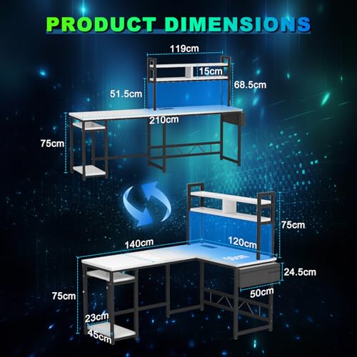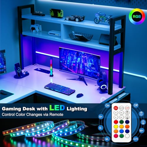 【USB-Ladeanschlüsse und Steckdosen】Der L-förmige Gaming-Tisch verfügt über LED-Beleuchtung sowie eine UPC-Halterung, Staufächer, Haken, Steckdosen und Lichtleisten. So können Sie Ihr Mobiltelefon, Ihre Gaming-Geräte oder Ihr Bluetooth-Zubehör bequem aufladen, während Sie arbeiten oder spielen.