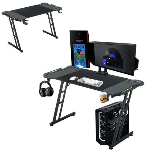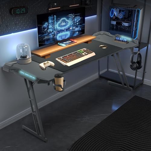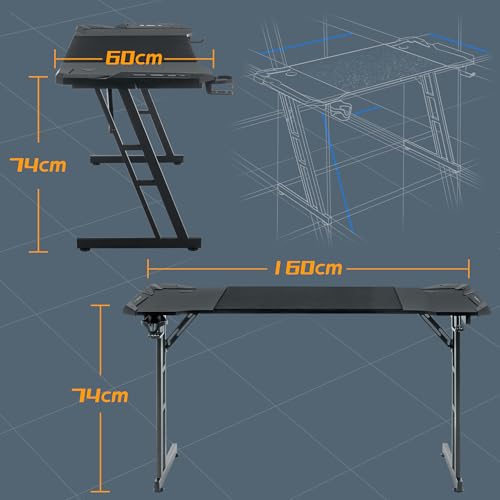 Froadp Gaming Schreibtisch mit LED 160x60cm Z-förmiger PC Gaming Tisch Schwarz Kohlefaseroberfläche Ergonomischer Computertisch mit Getränkehalter und Kopfhörer Haken 150 kg Belastbarkeit