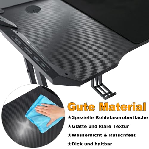 Modernes Design mit Carbonfaser-Oberfläche: Die elegante Carbonfaser-Struktur verleiht dem LED Gaming Desk einen sportlich-dynamischen Look, inspiriert von Rennwagen. Die glatte, strukturierte Oberfläche ist langlebig, pflegeleicht und sorgt für ein professionelles Erscheinungsbild