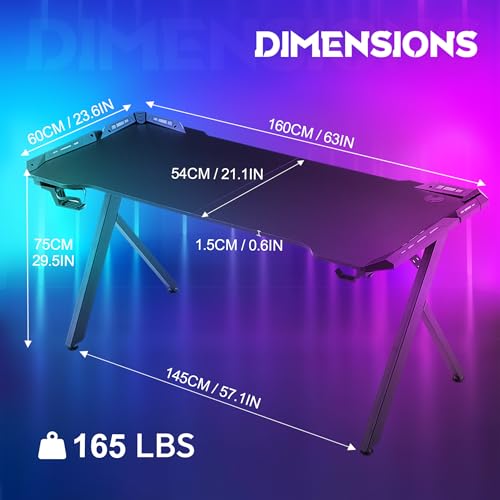 Gaming Tisch mit RGB LED 160×60 cm, Gaming Schreibtisch Ergonomischer Gamer PC Tisch mit Kohlefaser-Oberfläche, Spieltisch RGB Computertisch mit Fernbedienung & Kopfhörerhaken, Schwarz