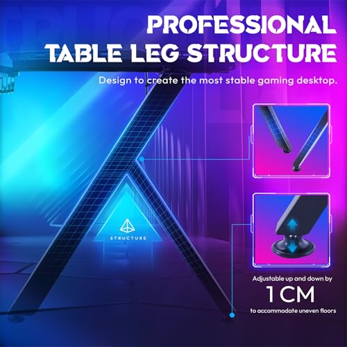 Stabiles Y-Frame Design für Gaming Tisch & Gaming Schreibtisch: Der Gaming Tisch verwendet ein professionelles Y-Frame-Gestell aus Stahl, das für maximale Stabilität beim Spielen sorgt. Die höhenverstellbaren Standfüße können um 1 cm angepasst werden, sodass der Gaming Schreibtisch auch auf unebenem Boden stabil steht – ideal als Gamer PC Tisch, RGB Gaming Tisch oder Computertisch für lange Gaming-Sessions.