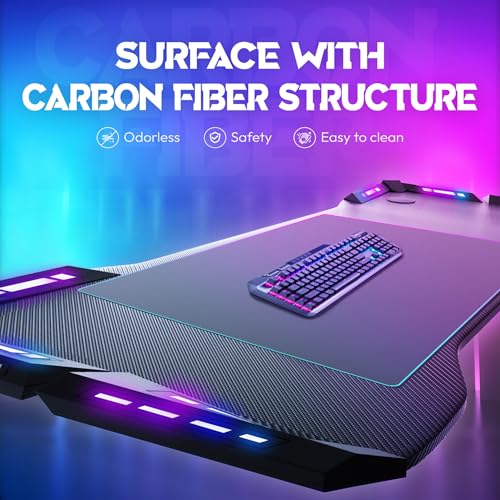Premium Kohlefaser-Oberfläche – robust, kratzfest & leicht zu reinigen: Die Tischplatte des Gaming Schreibtischs besteht aus MDF mit hochwertiger Kohlefaser-Struktur, die nicht nur modern aussieht, sondern auch kratzfest, geruchslos und pflegeleicht ist. Perfekt für intensiven Einsatz als Gaming Desk, RGB Computertisch oder Schreibtisch für Gaming-Zubehör.