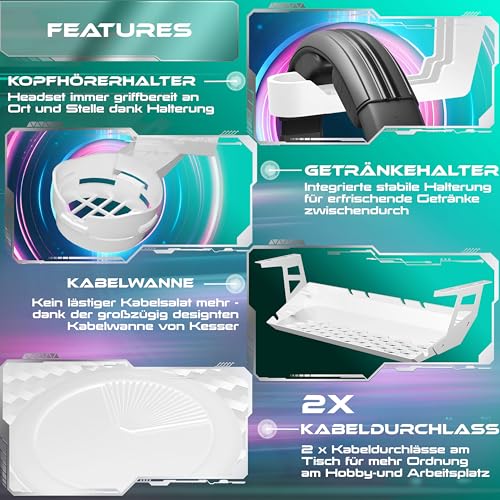 𝐎𝐏𝐓𝐈𝐌𝐈𝐄𝐑𝐓 𝐅Ü𝐑 𝐒𝐏𝐈𝐄𝐋𝐄𝐑: Mit integrierten Getränkehaltern, Kopfhörerhaken und einer Kabelwanne haben Ihre Gaming-Geräte einen festen Platz. Kabelführungslöcher sorgen für Ordnung auf dem Desktop.
