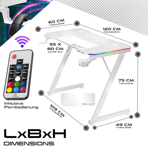 KESSER® Gaming Tisch LED 120cm x 60cm | Z-Form Gamer Schreibtisch | Kopfhörerhaken & Kohlebeschichtung | Ergonomischer PC Computertisch | Stabiler Tisch mit Getränkehalter Weiß