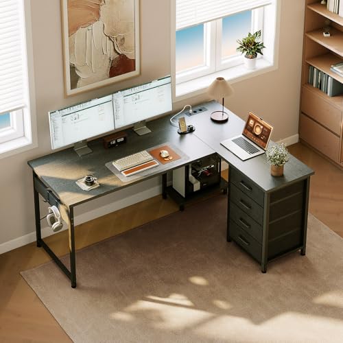 【Umkehrbares L-Design: Anpassbar an verschiedene Raumaufteilungen】 Dieser Schreibtisch mit schubladen verfügt über ein reversibles L-förmiges Design, das in der linken oder rechten Ecke des Raumes installiert werden kann und sich perfekt an Ihre Raumaufteilung anpasst. Viele Benutzer loben diese freie Konfiguration, die es ihnen ermöglicht, das Layout bei einem Umzug, einem Raumwechsel oder einer Neuanordnung von Räumen leicht anzupassen, ohne den Schreibtisch ersetzen zu müssen. Die CPU-Halterung an der Unterseite des Ecktisches bietet einen sicheren und bequemen Platz für Ihr Computergehäuse, geschützt vor Staub und Feuchtigkeit auf dem Boden.