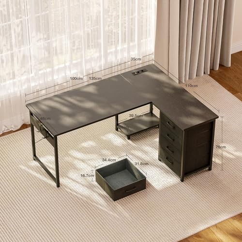 ODK Eckschreibtisch mit 4 Schubladen, 135×100 cm Schreibtisch L Form mit Steckdose und USB-Ladeanschluss, Reversibler Schreibtisch mit Stauraum für Homeoffice und Gaming, Schwarz