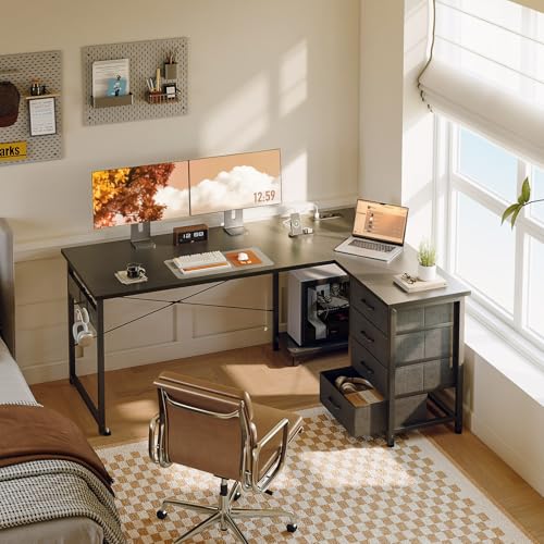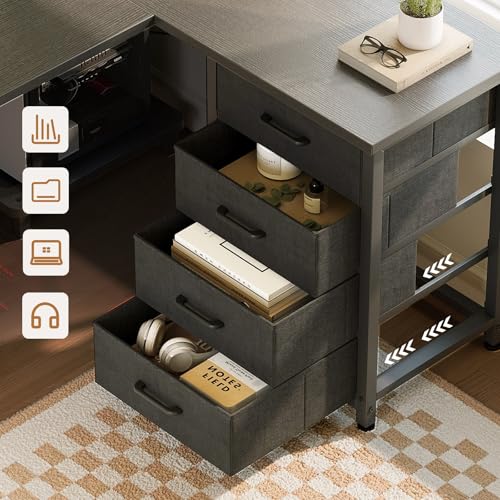 【4 Stoffschubladen + Haken: Ordnung und Effizienz für Ihr Home-Office】 Dieser Eckschreibtisch verfügt über 4 geräumige Stoffschubladen und 2 praktische Haken, die ausreichend Stauraum für Dokumente, Notizbücher, Schreibwaren und Alltagsgegenstände bieten. Mit der großzügigen L-förmigen Arbeitsfläche können Drucker, Scanner und andere Geräte bequem untergebracht werden – für ein aufgeräumtes und effizientes Arbeitsumfeld.