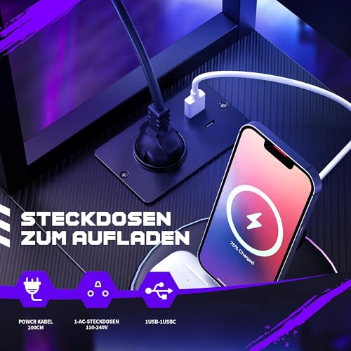 USB-Ladeanschlüsse und Steckdosen :Der L-förmige Schreibtisch ist mit 1 Ladestationen mit jeweils 1 Steckdosen und 1 USB und 1Type-C -Ladeanschlüssen für Ihre elektronischen Geräte ausgestattet. Sie können Ihr Smartphone, Ihre Gaming-Ausrüstung oder Bluetooth-Geräte einfach und bequem aufladen, wenn Sie arbeiten oder Spiele spielen.