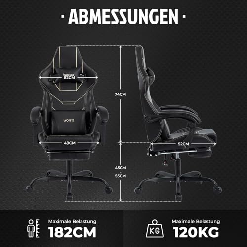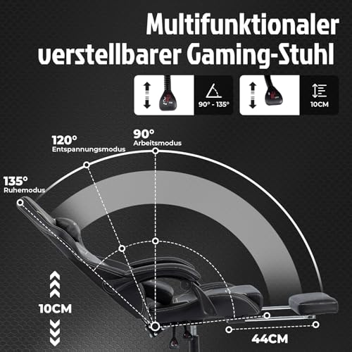 Gaming Stuhl Ergonomisch Gaming Chair Bürostuhl mit Fußstütze Racing Computerstuhl Höhenverstellbar Gepolstert Computerstuhl Lendenwirbelstütze Schwarz