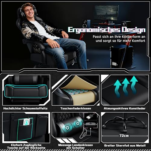 Entspannter Komfort: Lehnen Sie sich in die breite Rückenlehne und den weichen Sitz, stellen Sie die Kopfstütze ein und legen Sie die Beine auf der Fußstütze ab. Das USB-Massagekissen und die verstellbaren Armlehnen des Gaming Stuhls lockern Rücken und Schultern bei langen Sessions