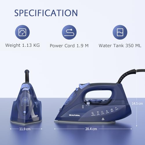 BEAUTURAL Dampfbügeleisen, 2600W Bügeleisen mit Keramik-Bügelsohle 350ML Tank 1,9M Kabellänge Selbstreinigung Abschaltautomatik Tropfstopp Blau (2600 Watt)