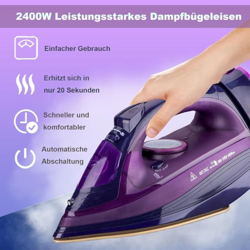 Dampfbügeleisen kabellos 2400W kabelloses Bügeleisen Sohle mit keramischer Antihaftbeschichtung Vertikal bügeln, Tropfstop, Antikalk, selbstreinigend mit Wassertank Steam Iron (Lila)