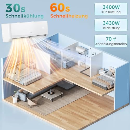 Hohe Leistung & Effizienz: Mit einer Leistung von 12000 BTU bietet diese Klimaanlage eine starke Kühlung und Heizfunktion und kann Räume bis zu 70 m² klimatisieren. Dank der Inverter-Technologie ist sie nicht nur leistungsstark, sondern auch extrem effizient, da sie den Verbrauch automatisch anpasst, um eine konstante Leistung zu gewährleisten.