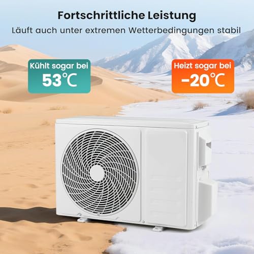 Schnelle Leistung & Ganzjahresbetrieb: Erleben Sie sofortige Erfrischung mit einer schnellen Kühlung in 30 Sekunden und Heizung in 60 Sekunden. Die leistungsstarke Außeneinheit arbeitet stabil unter extremen Wetterbedingungen – kühlt bei bis zu 53℃ und heizt bis zu -20℃.