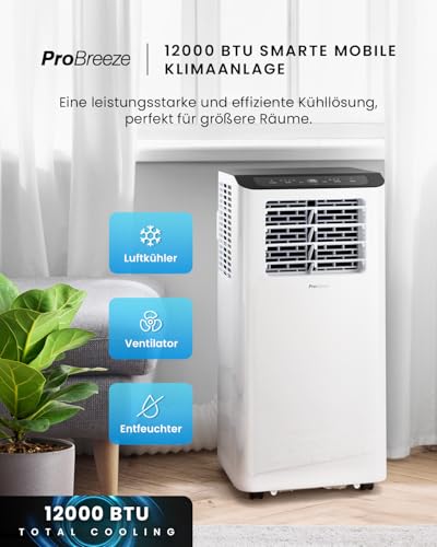 Pro Breeze 12000 BTU Mobile Klimaanlage (Räume bis 50㎡) – Klimaanlage mobil mit App-Steuerung, Timer & LED-Display – inkl. Fensterabdichtung & Abluftschlauch – Mobiles Klimagerät für Zuhause & Büro