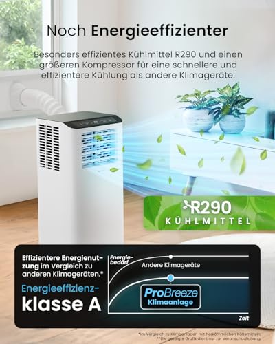 ENERGIESPAREND & UMWELTFREUNDLICH: Das Klimagerät Mobil hat die Energieeffizienzklasse A – ideal für heiße Tage ohne hohe Stromkosten. Das umweltfreundliche Kältemittel R290 ist bis zu 690-mal klimafreundlicher als herkömmliche Gase.