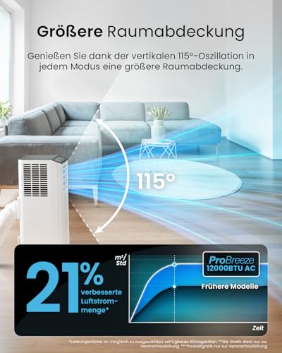 STARKE LEISTUNG: Diese Mobile Klimaanlage mit 12000 BTU sorgt für kraftvolle Kühlung bis auf 16 °C – perfekt für mittelgroße bis große Räume, Schlafzimmer oder das Homeoffice. Die automatisch schwenkbaren Lamellen lassen sich um 115° einstellen, um schneller für angenehme Temperaturen zu sorgen – effizient und energiesparend.