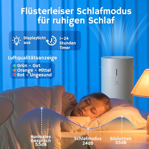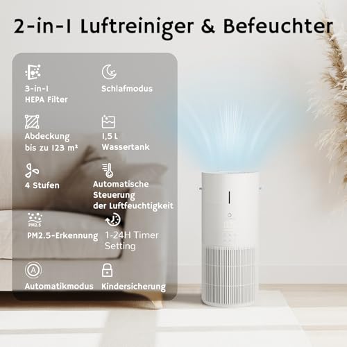 All-in-One Reinigung & Befeuchtung: Verabschieden Sie sich von Geräte-Chaos – dieses 2-in-1-Wunder vereint Luftreiniger und Luftbefeuchter in einem kompakten Gerät. Der Befeuchtermodul lässt sich leicht abnehmen und auch separat als Luftreiniger nutzen.