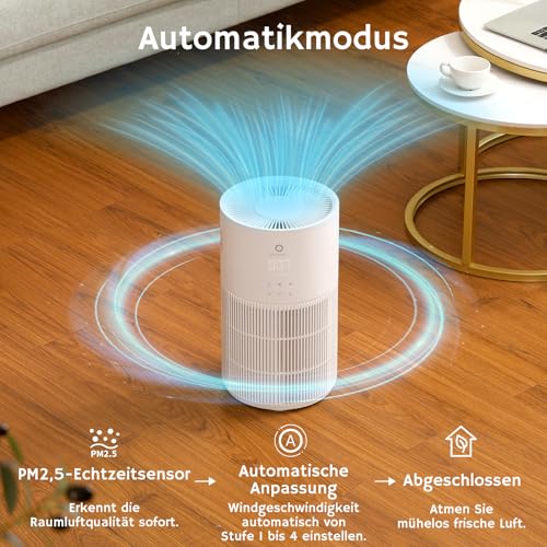 Leistungsstarke Filtration: Für Räume bis zu 123 m² (1325 ft²) geeignet. Das fortschrittliche 3-Stufen-Filtersystem filtert Partikel bis zu 0,03 Mikrometer sowie PM2.5 Schadstoffe – beseitigt 99,97 % der Verunreinigungen wie Rauch, Gerüche, Pollen und Allergene für saubere, frische Luft.