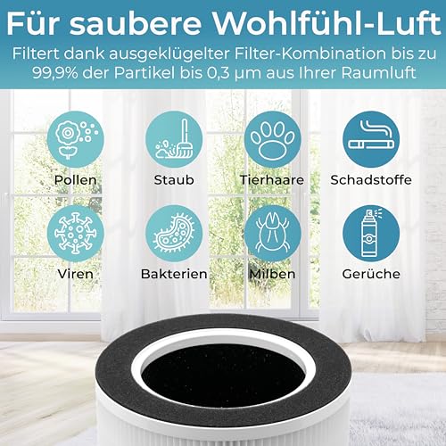 FILTER-KOMBINATION: Der Luftreiniger reinigt mit seinem 3-in-1 Filter, bestehend aus einem Vor-, Aktivkohle- und HEPA H13 Filter bis zu 99,9% aller Partikel bis 0,3 µm inklusive Bakterien, Viren, Pollen, Schimmel, Staub & Tierhaare