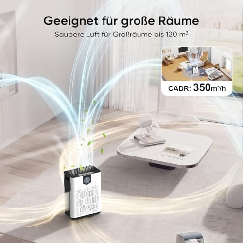 Luftreiniger für Allergiker, mit 2 × H14 HEPA Filtern & Waschbarem Vorfilter, CADR 350 m³/h, Große Räume bis 120 m², 6-stufiges Filtersystem, gegen Pollen, Tierhaare, Rauch & Raucherzimmer