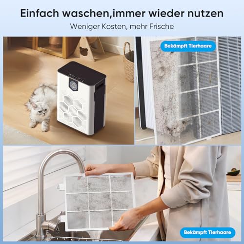 【Waschbare Filter, die Ersatzkosten sparen】Der herausnehmbare, waschbare Vorfilter aus feinem Gewebe ist die erste Verteidigungslinie gegen Tierhaare, Hautschuppen, Fell, Fasern und größere Partikel in der Raumluft. Er ist leicht zu reinigen oder abzusaugen und trägt dazu bei, die Lebensdauer eines echten HEPA-14-Filters zu verlängern, wodurch Sie die Kosten für häufige Filterwechsel sparen. Wir engagieren uns für frische Luft und ein gesundes, komfortables Umfeld in Ihrem Zuhause